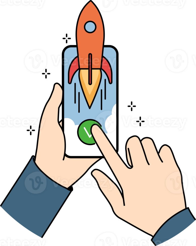 mãos com telefone com foguete simbolizando velozes Internet e alta qualidade rede para usando Móvel aplicativos. Smartphone com alta velocidade Internet para surfar sites e assistindo videos em vídeo hospedagem PNG Pro