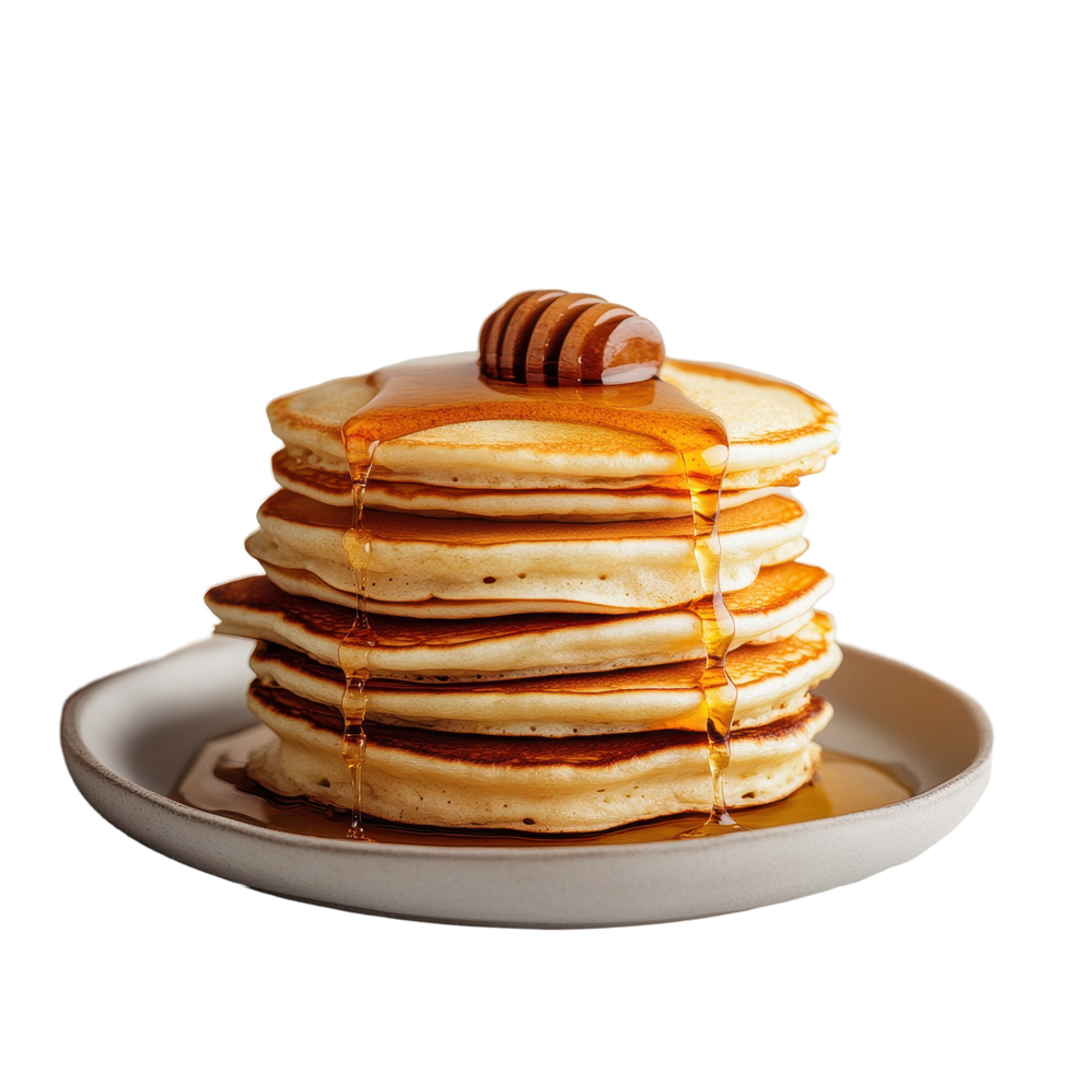 delicioso pilha do panquecas garoa com xarope e coberto com querida em uma rústico mesa contexto, pilha panquecas com xarope e querida em uma mesa, transparente fundo, fundo PNG Grátis