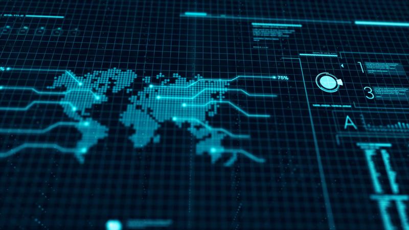 Conceito cibernético futurista de interface de exibição frontal de renderização 3D, com profundidade rasa de efeito de campo, escuro e grão processado Vídeo Pro