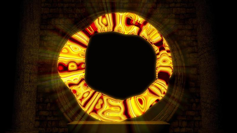 porta interdimensional formada por um arco circular de plasma incandescente flutuando dentro de um antigo castelo com uma parede de pedra ao fundo. seqüência de loop. animação 3d Vídeo Grátis