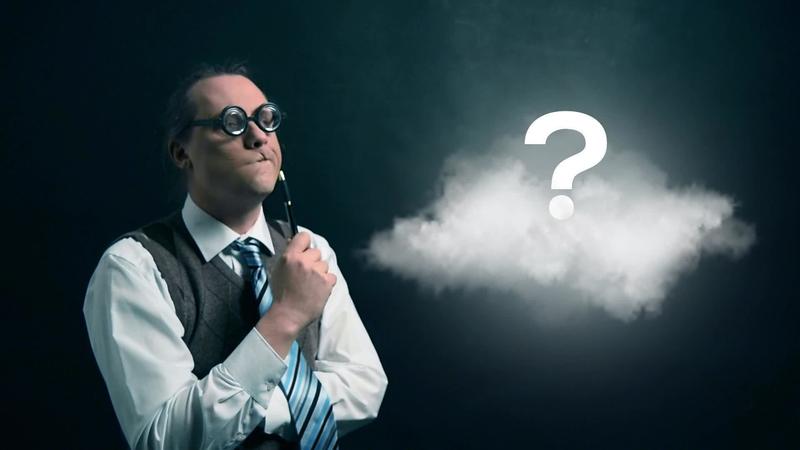 nerd ou geek engraçado olhando para uma nuvem voadora com um ícone de ponto de interrogação giratório Vídeo Grátis