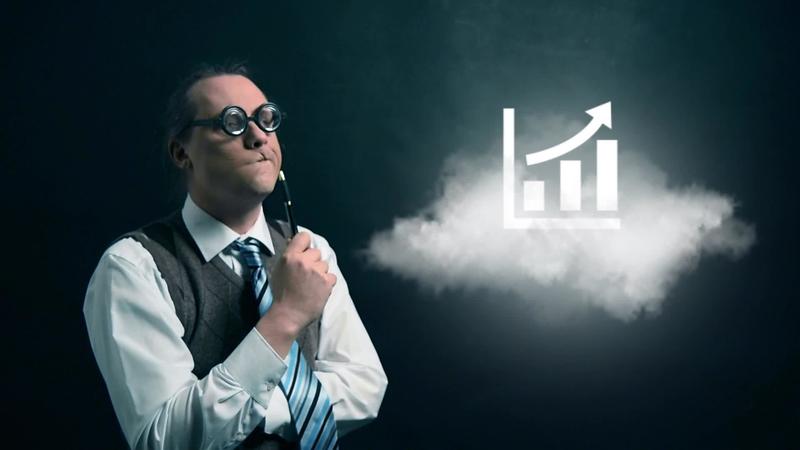 nerd ou geek engraçado olhando para a nuvem voadora com o ícone do gráfico rotativo Vídeo Grátis