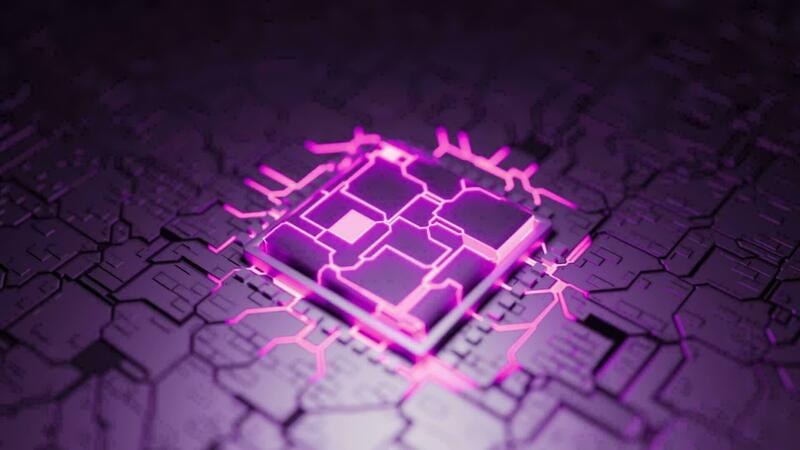 3d animação cubo lasca fechar acima. computador o circuito borda com roxa linhas Vídeo Grátis