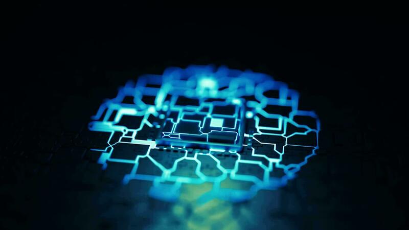 3d animação cubo lasca fechar acima. computador o circuito borda com azul linhas Vídeo Grátis