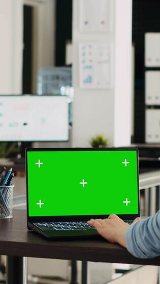 vertical vídeo especialista usando computador portátil com tela verde para resolver o negócio tarefas e operações dentro escritório, olhando às chromakey exibição dentro coworking espaço. mulher trabalhando em sem fio pc com copyspace. Vídeo Pro