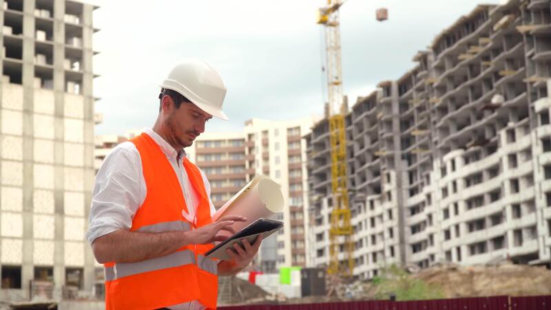 arquiteto ou engenheiro trabalhando, navegando construção projeto do construção local com tábua. construção construção conceito Vídeo Pro