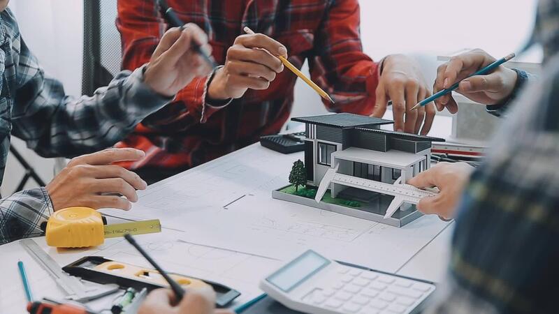 arquiteto e engenheiros com esboço, projeto plano do construção e tábua falando em construindo local. construção Gerente e engenheiro trabalhando em construção local. Vídeo Pro