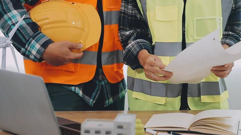 arquiteto e engenheiros com esboço, projeto plano do construção e tábua falando em construindo local. construção Gerente e engenheiro trabalhando em construção local. Vídeo Pro