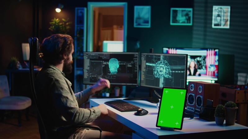 foco em isolado tela tábua Próximo para programador atualizando artificial inteligência, fazer isto tornar-se autoconsciente. isto especialista programação auto consciente ai com croma chave dispositivo, Câmera b Vídeo Pro