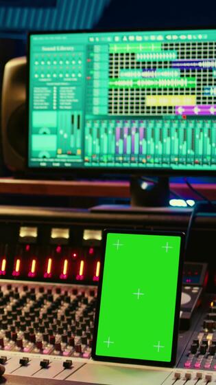 vertical audio especialista em processamento sons Próximo para tábua com isolado brincar, trabalhando dentro postar Produção com mistura console e técnico engrenagem. produtor empurrando comutadores e controles deslizantes. Câmera b. Vídeo Pro