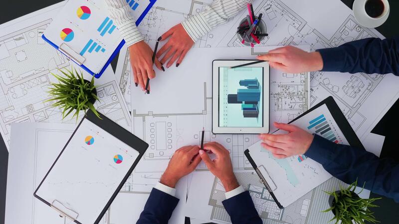 topo Visão do arquitetos e interior designers encontro inspecionando e concluindo com projeto do mudança renovação projeto. engenheiros debate usando moderno dispositivo em cópia de espaço, plano deitar conceito Vídeo Pro