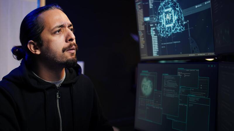 hacker usando ai máquina Aprendendo para encontrar sem patch conexões e roubar dados. fechar acima tiro do scammer usando artificial inteligência para compromisso digital dispositivos e ilegalmente ganhando informação, Câmera b Vídeo Pro