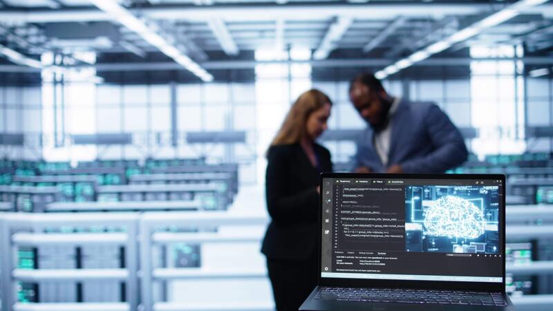 fechar acima do computador portátil com ai tecnologia usava para sustentar dados Centro hardware. foco em caderno usava de servidor quarto programadores dentro fundo usando artificial inteligência tecnologia, Câmera b Vídeo Pro