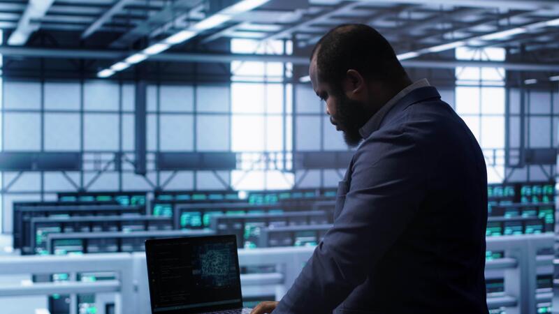 Programas desenvolvedor dentro dados Centro usando artificial inteligência Informática simulando humano cérebro. isto Apoio, suporte funcionários membro trabalhando em caderno com ai máquina Aprendendo algoritmos, Câmera uma Vídeo Pro