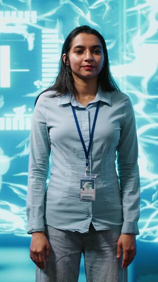 vertical retrato do sorridente técnico corrida artificial inteligência programação scripts. alegre admin trabalhando dentro isto departamento encarregado com ai formulários desenvolvimento, Câmera uma Vídeo Pro