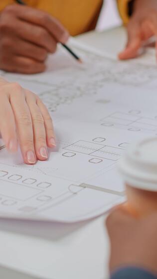 vertical corretores equipe e empreendedor discutindo uma real Estado potencial, avaliando arquitetônico planos e negociando contrato termos para alugando uma Alto classe escritório espaço. aluguel acordo às escrivaninha. Câmera b. Vídeo Pro