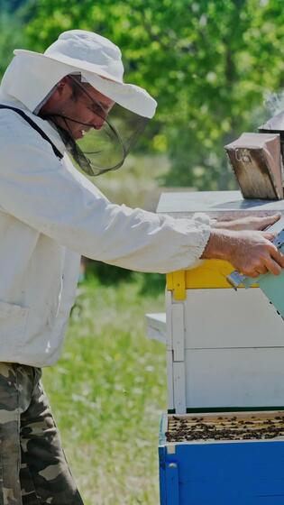 apicultor é trabalhando com abelhas e colmeias em a apiário. quadros do uma abelha colmeia. apiário conceito vertical Vídeo Grátis