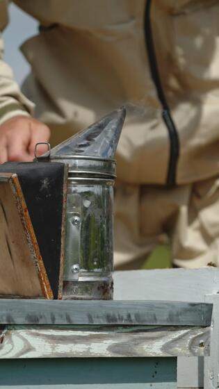 fumante ferramenta pronto para uso às abelha colmeia. apicultor usa metal instrumento para extrair quadro, Armação a partir de colmeia e examinar isto. borrado pano de fundo. vertical Vídeo Grátis