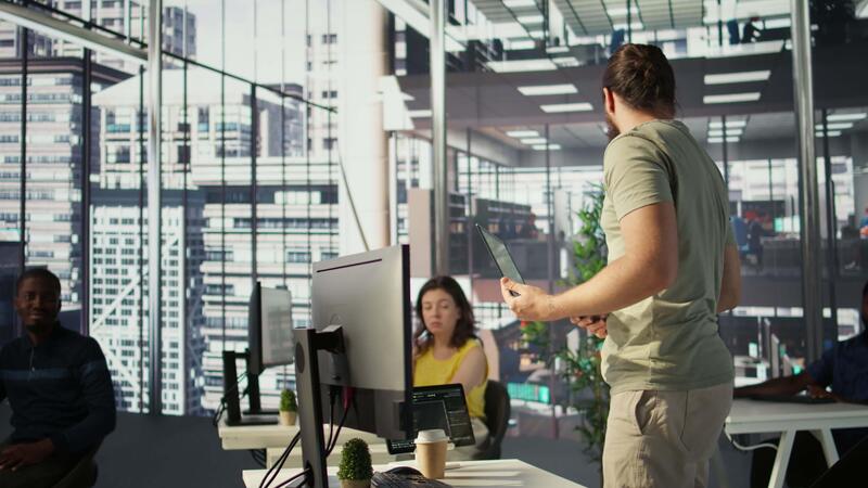 alegre admin segurando computador portátil conversando com colegas enquanto trabalhando com máquina Aprendendo tech. homem transformando dados para dentro preditivo modelos usando caderno e falando com colegas de trabalho, Câmera b Vídeo Pro