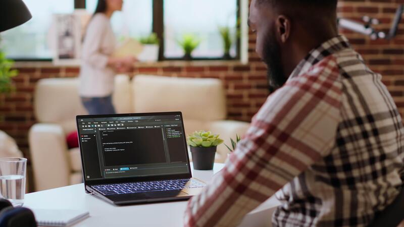 masculino programador em desenvolvimento a aplicativo em dele computador portátil e trabalhando remotamente. casa escritório configuração inclui digital Ferramentas e focos em Programas Engenharia e codificação, isto especialista. Câmera b. Vídeo Pro