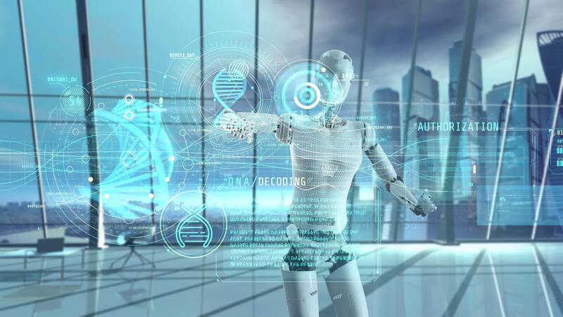andróide trabalho em uma holográfico painel com dna. 3d render Vídeo Pro