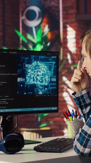 ai Programas desenvolvedor às computador esperando para código para terminar compilando, fricção testa com caneta, sentindo-me entediado. impaciente homem espera para artificial inteligência scripts para terminar compilando, Câmera b Vídeo Pro