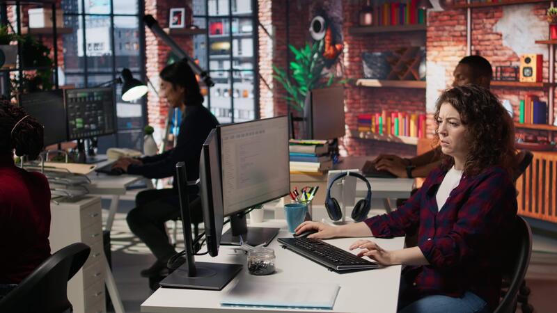 comece programador colaborando com colega para teste companhia Programas, identificando gargalos. equipe do engenheiros escrevendo limpar, eficiente código dentro programação língua para reduzir erros, Câmera uma Vídeo Pro