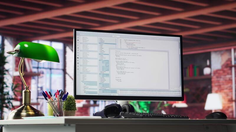 organizado escrivaninha ideal para escrevendo binário código e analisando dados, à moda tecnologia casa escritório com elegante arquitetura. construção desempenho dirigido interfaces e conectados formulários. Vídeo Pro