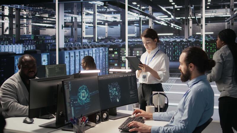 dados Centro equipe do técnicos trabalhando em neural rede Programas desenvolvimento. servidor cubo colegas implementando profundo Aprendendo artificial inteligência tecnologia dentro ambiente de trabalho, Câmera uma Vídeo Pro