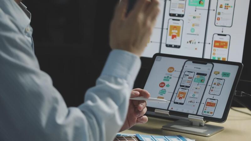 uma homem é usando uma computador para exibição uma tela com uma Móvel aplicativo Vídeo Grátis