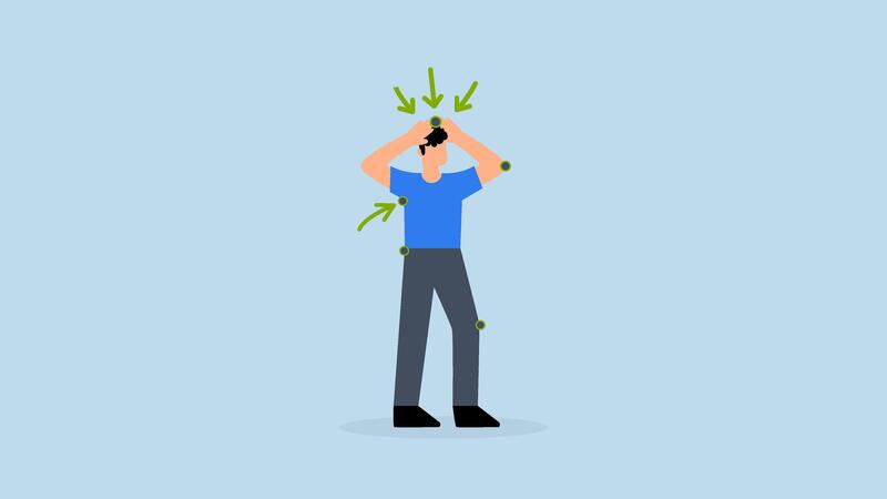 cliente dor pontos. 4k animação do infeliz cliente com de várias Setas; flechas apontando para a fonte do a problema. Vídeo Pro