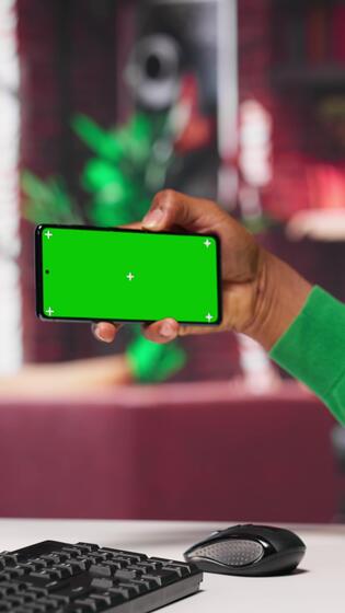 vertical africano americano homem noivando com ai chatbot Próximo para croma chave, usando a virtual assistente com Comandos para dados dirigido algoritmos para realçar produtividade às casa escritório. Câmera uma. Vídeo Pro