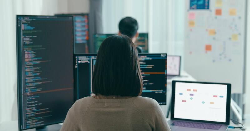 grupo Ásia masculino fêmea freelance digitando escrever pronto ai robô isto aplicativo inteligente programa nômade, jogo, terminal com codificação linguagem, do utilizador interface, desenhista, grande dados Centro em Área de Trabalho computador. Vídeo Pro