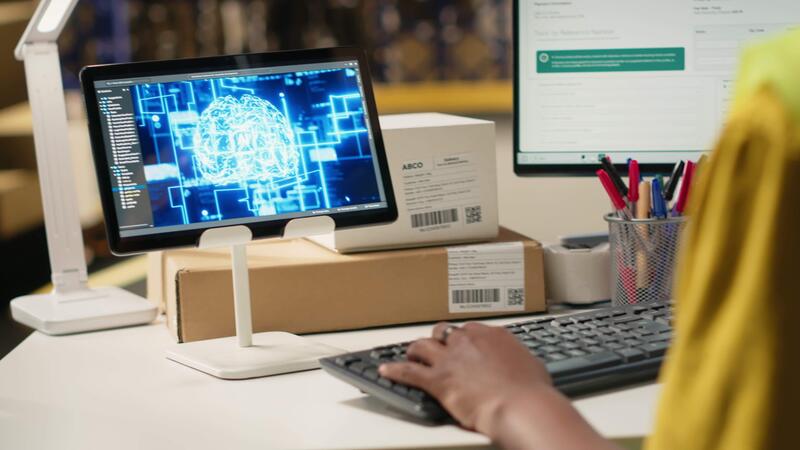 mulher usa Programas para ordem em processamento automação, avançado neural redes nuvem Informática sistema Garantir parcela rastreamento com uma computador dentro armazém com prateleiras. Câmera b. Vídeo Pro