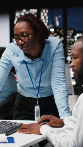 vertical africano americano funcionários membros usar ai chatbot sistema às pc para problema resolução tarefas, futurista Alto tecnologia destacando inteligente algoritmos e profundo aprendizado. comunicação e isto apoiar. Câmera b. Vídeo Pro