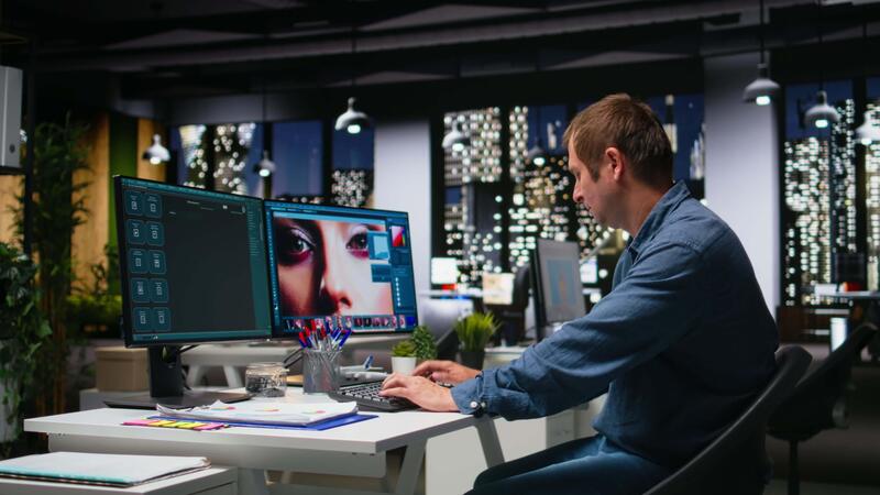 masculino foto editor trabalhando em criativo retocada e criando materiais com artificial inteligência. gerando conteúdo para portfólio, usando ai chatbot Programas e edição. Câmera uma. Vídeo Pro