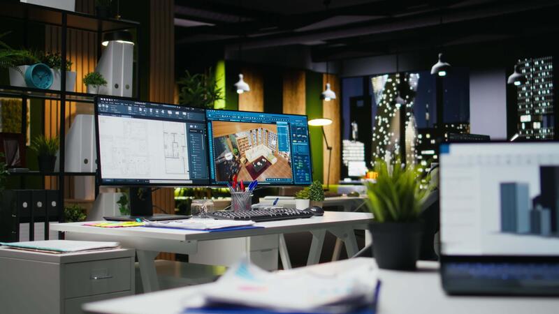 Inovativa escritório apresentando dual monitores corrida avançado 3d Renderização programas para interior Projeto e construção planejamento. digital área de trabalho construído para criatividade e projeto gerenciamento. Vídeo Pro