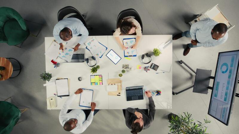 topo baixa Visão ampliação dentro do corporativo empregados colhido dentro uma encontro para discutir finança, Objetivos e propostas. colegas compartilhar percepções, documentos e Métricas para guia projeto planejamento. Câmera uma. Vídeo Pro