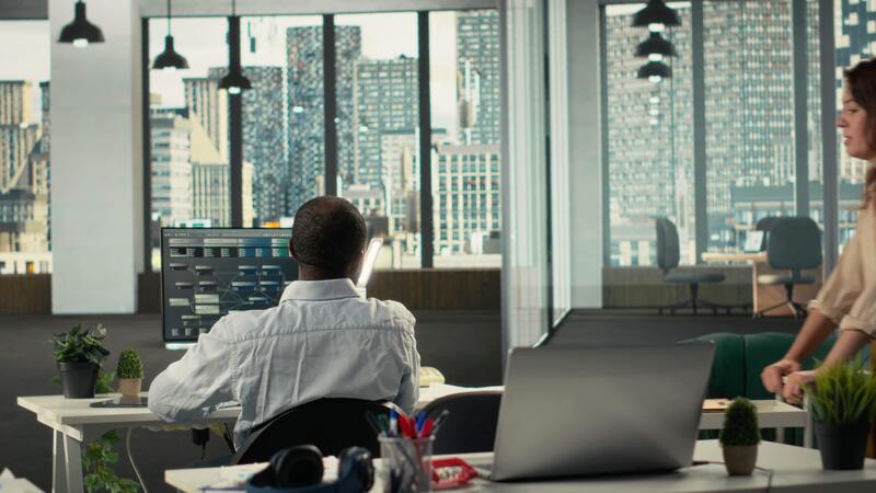 secretário ajudando colegas com arquivado arquivos dentro moderno ambiente de trabalho, revendo gráficos e análise. empregados discutir projeto progresso, relatório escrevendo e dados visualização. Câmera b. Vídeo Pro