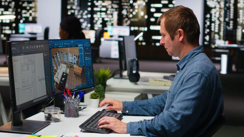 diverso engenheiros equipe cria 3d render do apartamento interior com arquitetônico Programas e projetos. usando computador com moderno Ferramentas e modelos para permitir costumização do pavimentação. Câmera b. Vídeo Pro