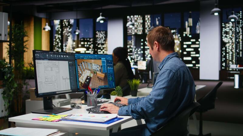 diverso engenheiros equipe cria 3d render do apartamento interior com arquitetônico Programas e projetos. usando computador com moderno Ferramentas e modelos para permitir costumização do pavimentação. Câmera uma. Vídeo Pro