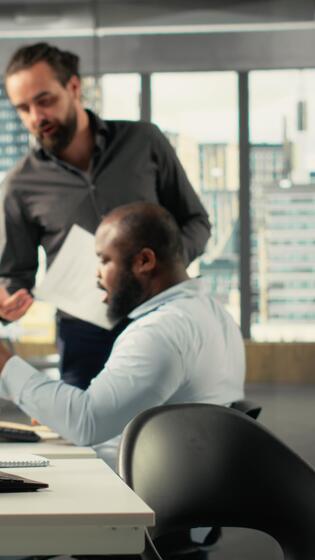 vertical o negócio associados encontro para Reveja orçamento e recurso alocação dentro uma instruções sessão. multinacional companhia trabalhos equipe analisando dados para estratégico planejamento e crescimento. Câmera b. Vídeo Pro