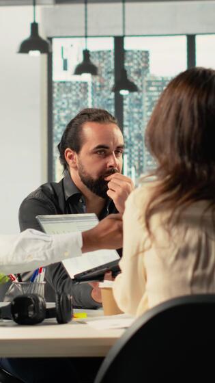 vertical diverso o negócio colegas colhido por aí laptops trabalhando em projeto tarefas para desenvolvimento. escritório meio Ambiente promove sinergia, trabalho em equipe e discernimento através análise. Câmera b. Vídeo Pro