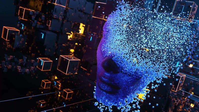 abstrato digital cabeça com partículas e brilhando cubos representando artificial inteligência e dados em processamento. Vídeo Pro