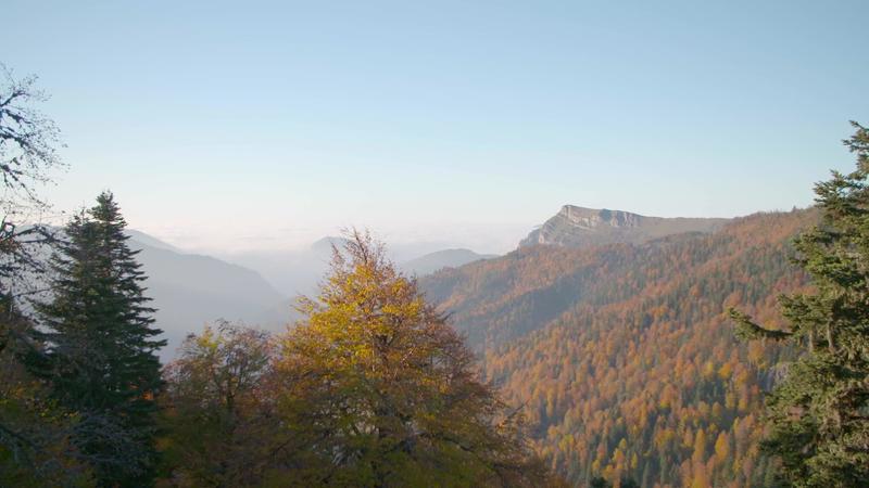 montanhas nubladas e floresta no outono. vista maravilhosa de nuvens e árvores coloridas no outono. Vídeo Pro